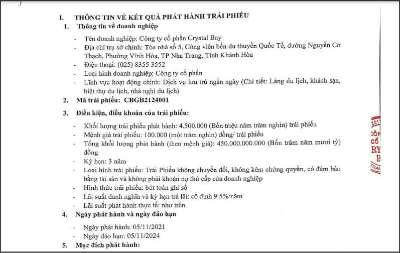 Theo thông tin được công bố, ngày 5/11/2021, CTCP Crystal Bay (Crystal Bay) đã phát hành 450 tỉ đồng trái phiếu mã CBGB2124001 với lãi suất cố định 9,5%/năm, kỳ hạn 3 năm, cho một công ty chứng khoán trong nước. Công ty cho biết, mục đích phát hành nhằm tăng quy mô vốn hoạt động để phục vụ cho hoạt động đầu tư, sản xuất kinh doanh và các mục đích khác.