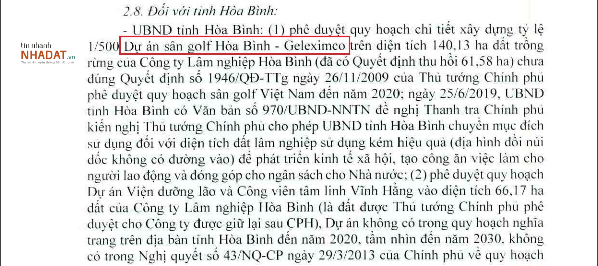 Cụ thể, vào ngày 09/02/2021, Thanh tra Chính phủ đã có Thông báo Kết luận số 238/TB-TTCP về việc kết luận thanh tra việc chấp hành pháp luật trong quản lý và sử dụng đất đai, trong đó có đất có nguồn gốc từ nông, lâm trường quốc doanh theo Chỉ thị số 11/CT-TTg ngày 04/4/2016 của Thủ tướng Chính phủ tại Tập đoàn Công nghiệp cao su Việt Nam; Tổng Công ty Lâm nghiệp và Tổng Công ty Chè Việt Nam. Trong đó, dự án sân golf Hòa Bình – Geleximco được nhắc đến.