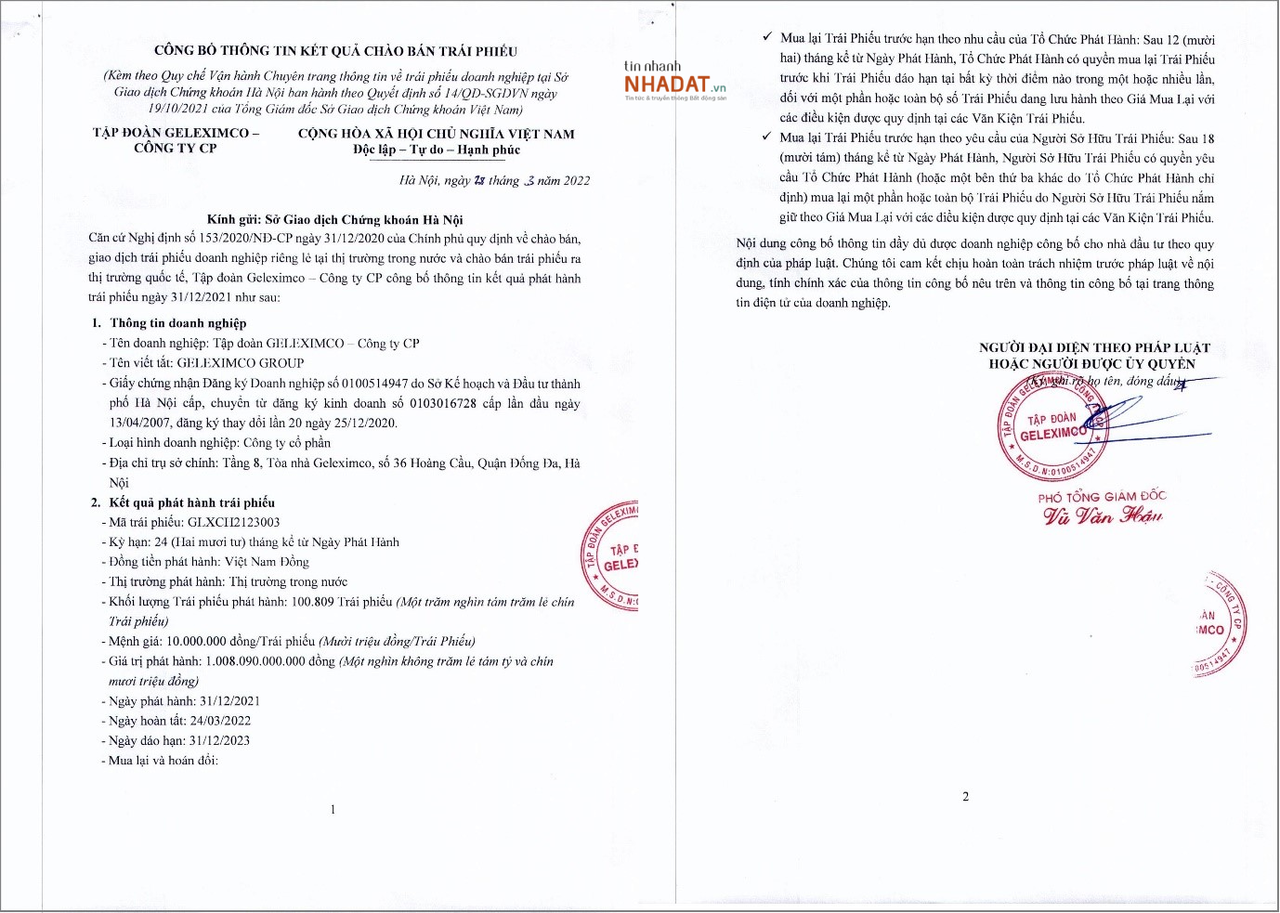 Lô trái phiếu được chào bán có khối lượng 100.809 trái phiếu, mệnh giá 10 triệu đồng/trái phiếu. Kết thúc đợt phát hành, Geleximco thu về thêm 1.008 tỷ đồng.
