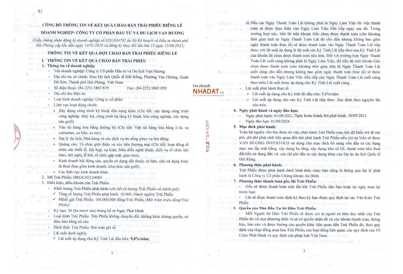 Lô trái phiếu trên có kỳ hạn 36 tháng (đáo hạn vào ngày 1/9/2024), lô trái phiếu được hoàn tất vào ngày 30/9/2021 với lãi suất 9,8%/năm. Toàn bộ số tiền thu được cũng sẽ sẽ dùng để bổ sung vốn đầu tư vào dự án Khu du lịch quốc tế Đồi Rồng. Tài sản đảm bảo cho lô trái phiếu là quyền tài sản phát sinh từ việc đầu tư, xây dựng, kinh doanh, khai thác Dự án Khu du lịch quốc tế Đồi Rồng