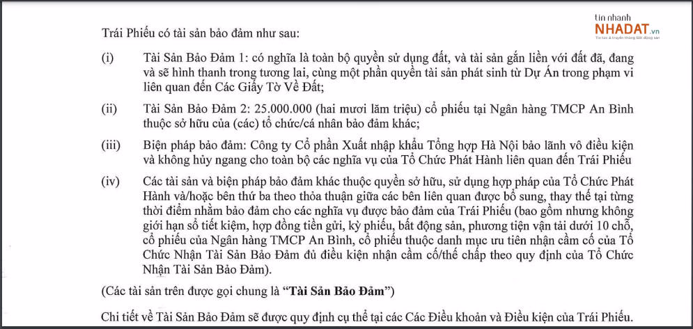 Tài sản đảm bảo cho lô trái phiếu này là toàn bộ quyền sử dụng đất và tài sản gắn liền với đất đã, đang và sẽ hình thành trong tương lai, cùng một phần quyền tài sản phát sinh từ Dự án Khu du lịch quốc tế Đồi Rồng. Ngoài ra, tài sản đảm bảo còn là 25 triệu cổ phiếu tại Ngân hàng TPCP An Bình (ABBank).