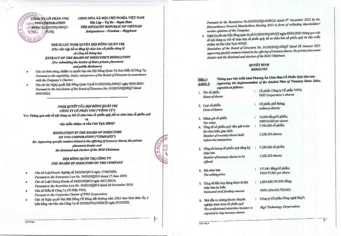 Bên cạnh thông báo thay đổi nhân sự cấp cao, Hội đồng quản trị VNG cũng đã thông qua về phương án bán toàn bộ hơn 7,1 triệu cổ phiếu quỹ cho Công ty cổ phần Công nghệ BigV, với mức giá gần 178.000 đồng mỗi cổ phần, VNG dự kiến huy động được 1.264,4 tỷ đồng từ thương vụ này.