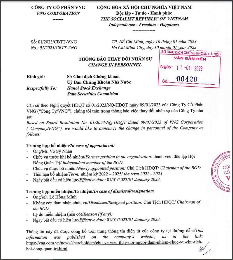 Theo thông tin từ VNG, vào ngày 11/1/2023 doanh nghiệp đã công bố thông tin về việc bổ nhiệm ông Võ Sỹ Nhân làm Chủ tịch HĐQT nhiệm kỳ 2022 - 2025 kể từ ngày 1/1/2023.
