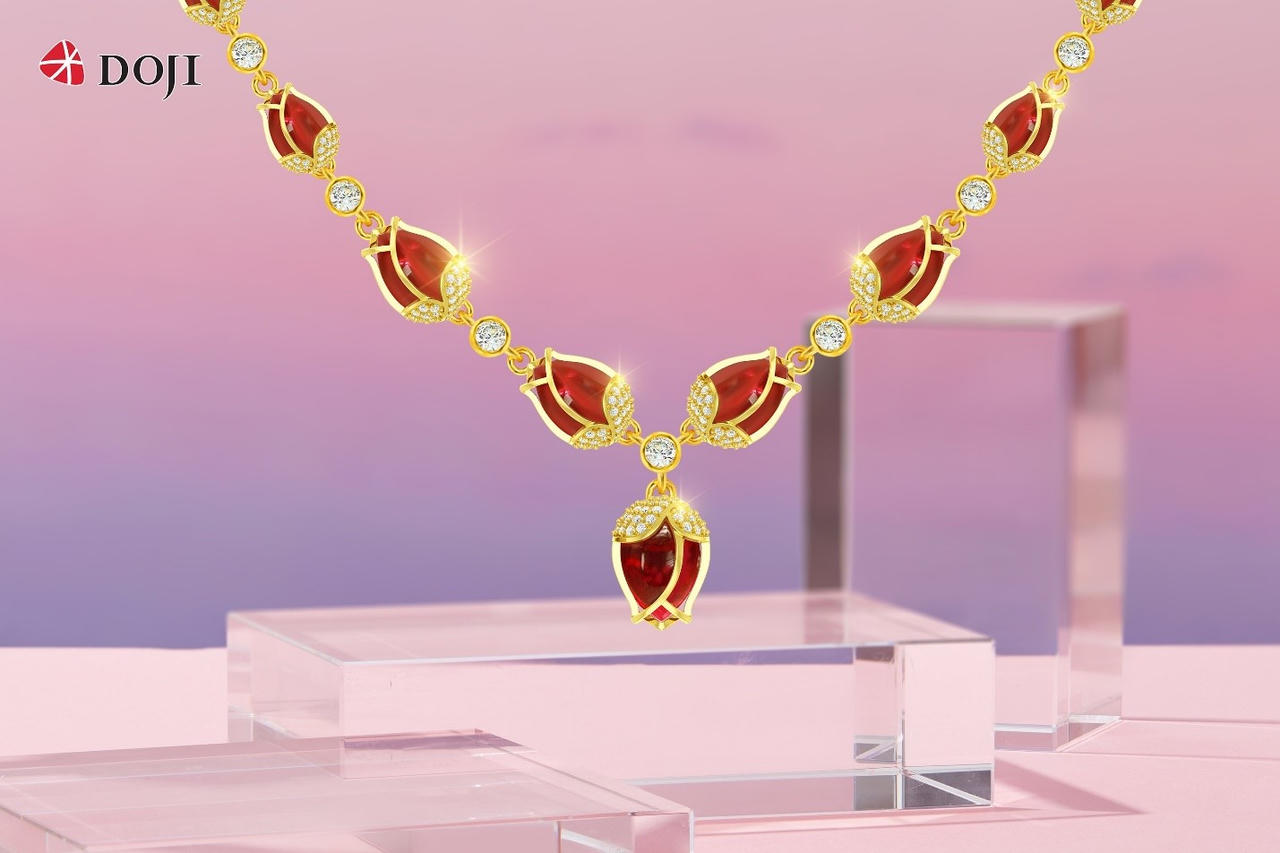 BST “Nữ hoàng mùa Xuân” của DOJI đã khắc hoạ nét đẹp độc đáo ấy trên chất liệu Vàng 24K kết hợp với đá màu mang sắc đỏ nổi bật, tượng trưng cho yêu thương bất diệt và nồng cháy mà bạn muốn trao gửi đến người phụ nữ. Vẻ đẹp quyến rũ, kiêu sa và sự mạnh mẽ ẩn chứa trong những món trang sức hoa Tulip đỏ chính là hình ảnh đại diện của phụ nữ Việt thời nay.