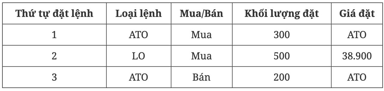 HoSE đã đưa ra 3 trường hợp ví dụ. Thứ nhất, lệnh LO (lệnh giới hạn) mua giá trần được nhập trước lệnh ATO mua. Trong đợt khớp lệnh định kỳ xác định giá mở cửa, cổ phiếu A (giá tham chiếu: 39.000 đồng/cổ phiếu; giá trần: 41.700 đồng/cổ phiếu; giá sàn: 36.300 đồng/cổ phiếu) có sổ lệnh như sau: