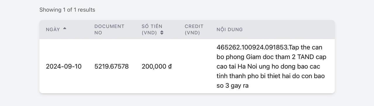 Cụ thể, sao kê dài 12.028 trang, thống kê chi tiết ngày, số tiền cũng như nội dung giao dịch của người dân, từ những giao dịch vài nghìn đồng đến hàng trăm triệu đồng, tất cả đều là tấm lòng của nhân dân cả nước để ủng hộ đến những đồng bào chịu ảnh hưởng do bão số 3. Tính đến 17h ngày 12/9, số tiền các tổ chức, cá nhân chuyển về tài khoản của Ban Vận động cứu trợ trung ương là 527,8 tỷ đồng.
