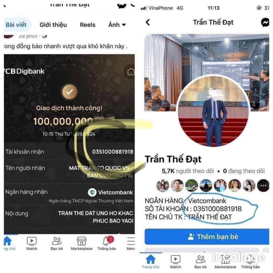 Mặt khác, một tài khoản trên Threads tên T.D.A, hoạt động trong lĩnh vực "đầu tư tiền điện tử" chia sẻ chuyển 100 triệu đồng ủng hộ kèm với lời kêu gọi "Cho đi là còn mãi", anh đính kèm ảnh chụp màn hình chuyển khoản tới Mặt trận Tổ Quốc Việt Nam khoản tiền 100 triệu đồng.