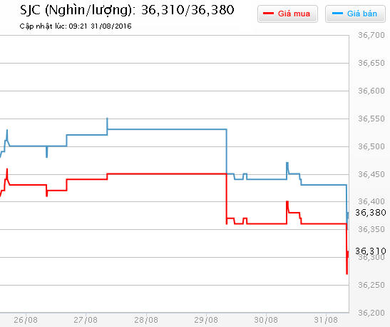 Tại thị trường Hà Nội, giá vàng đang được yết tại mức giá 36.31 (mua vào) – 36.38 (bán ra) triệu đồng/lượng, giảm 50,000 đồng/lượng so với phiên giao dịch cuối ngày 30/08.