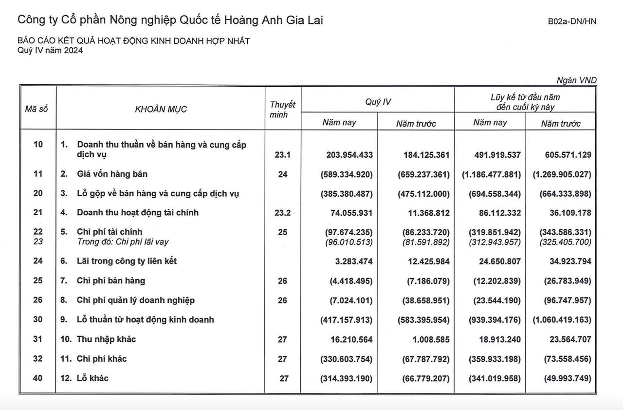 Luỹ kế năm 2024, HAGL Agrico chỉ thu về 492 tỷ đồng, giảm 19% so với năm 2023. Công ty báo lỗ sau thuế 1.277 tỷ và là năm thứ 4 liên tiếp báo lỗ trên nghìn tỷ.