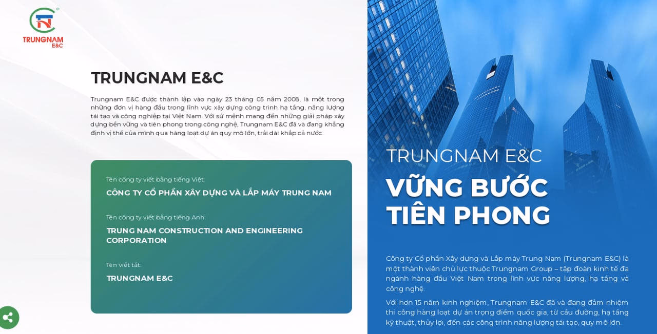 Theo giới thiệu trên website, Công ty cổ phần Xây dựng và Lắp máy Trung Nam (Trungnam E&C) được thành lập vào ngày 23/5/2008, là một trong những đơn vị hàng đầu trong lĩnh vực xây dựng công trình hạ tầng, năng lượng tái tạo và công nghiệp tại Việt Nam.