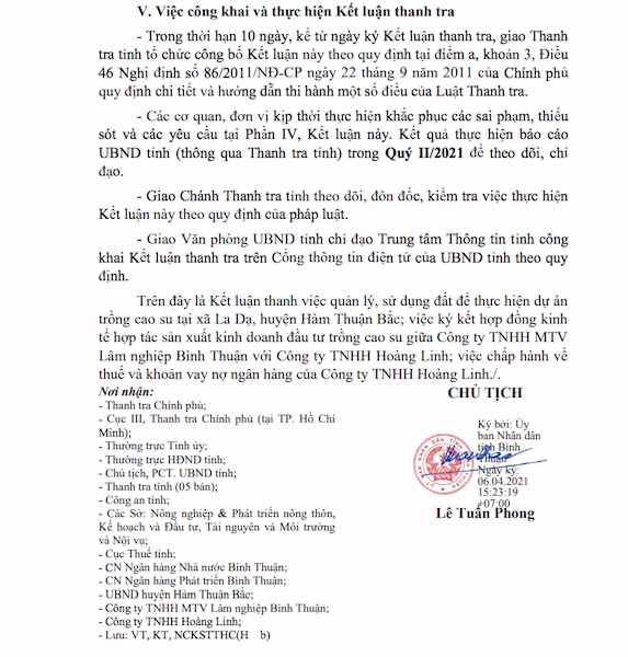 Chủ tịch UBND tỉnh Lê Tuấn Phong yêu cầu Giám đốc Sở NN&PTNT có trách nhiệm theo dõi, đôn đốc Công ty Lâm nghiệp Bình Thuận làm việc với Công ty Hoàng Linh để rà soát, xử lý dứt điểm đối với các vấn đề tồn tại, trường hợp không thống nhất thì có báo cáo, đề xuất UBND tỉnh giao cơ quan chức năng tham mưu UBND tỉnh xem xét, thu hồi Giấy chứng nhận đầu tư số 48121000411 ngày 30/7/2009 và thu hồi diện tích đất đã cho Công ty Lâm nghiệp Bình Thuận thuê tại xã La Dạ, huyện Hàm Thuận Bắc theo quy định, không để xảy ra tình trạng đất Nhà nước nhưng để doanh nghiệp tư nhân sử dụng trong thời gian dài mà không thực hiện đầy đủ nghĩa vụ tài chính với Nhà nước.