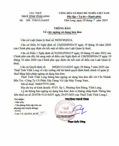 Theo thông tin từ Thuế tỉnh Vĩnh Long, đơn vị này vừa ban hành quyết định về việc cưỡng chế thuế bằng biện pháp ngừng sử dụng hóa đơn đối với Chi nhánh Bến Tre - Công ty cổ phần Xây dựng và Lắp máy Trung Nam (Trungnam E&C) do nợ thuế.