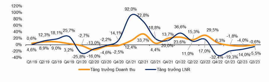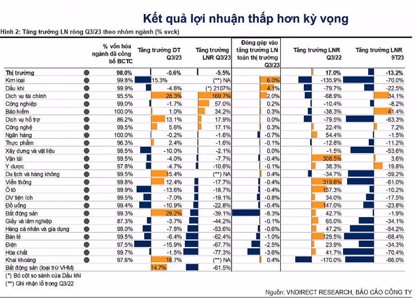 Theo thống kê của Công ty Chứng khoán VNDirect, tính đến ngày 07/11, đã có 1.166 công ty niêm yết trên ba sàn chứng khoán gồm HOSE, HNX, UPCOM, chiếm 98,0% vốn hóa thị trường, đã công bố kết quả kinh doanh quý 3 năm 2023. Tổng lợi nhuận ròng của các doanh nghiệp niêm yết giảm 5,5% so với cùng kỳ. Kết quả này dẫn tới quý thứ 4 liên tiếp lợi nhuận của doanh nghiệp niêm yết giảm.
