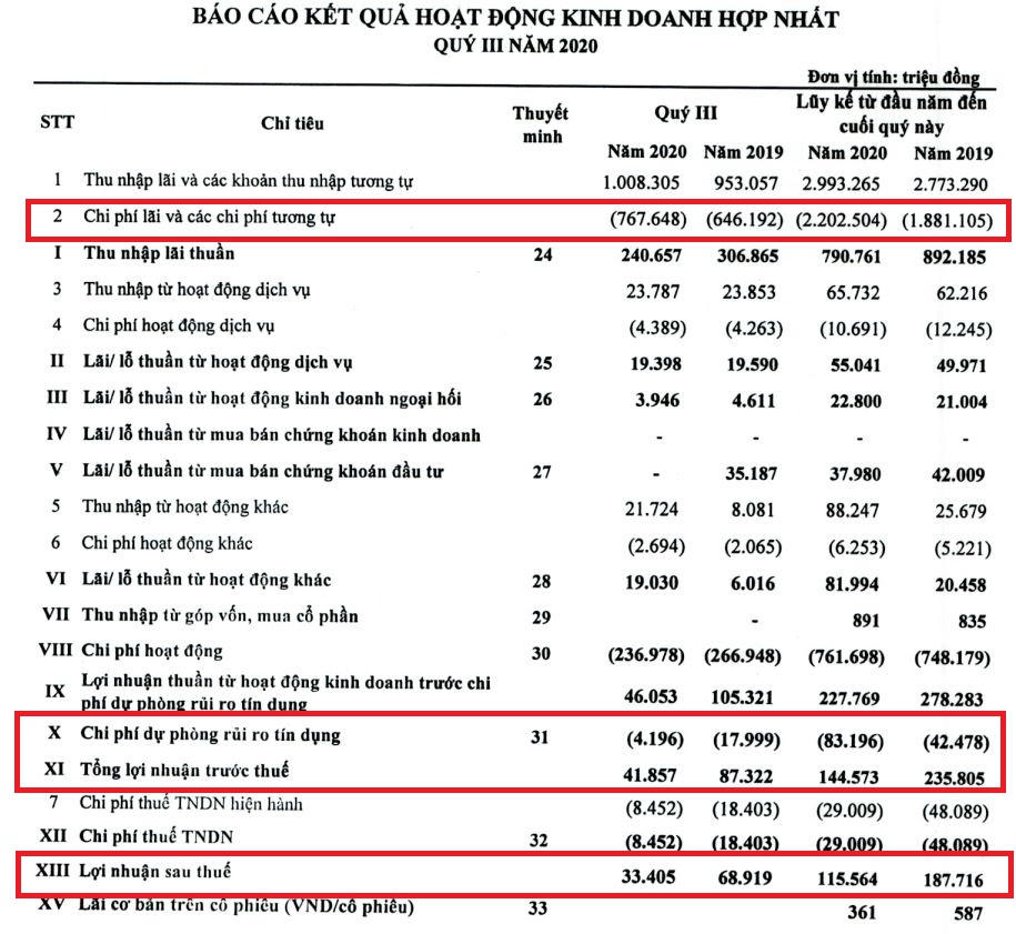 Tương tự, trong báo cáo tài chính quý 3/2020 của LienVietPostBank, chi phí trả lãi tiền gửi tăng cũng tác động không nhỏ tới lợi nhuận ngân hàng chỉ tăng nhẹ 6%.