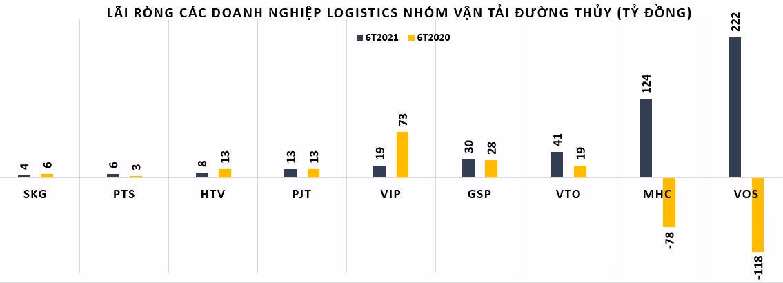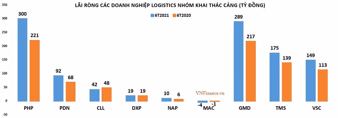 Ngược lại, CTCP Gemadept (GMD) lại ghi nhận doanh thu thuần nửa đầu năm 2021 tăng 19% lên 1.439 tỷ đồng và lợi nhuận sau thuế tăng 39% đạt. Tương tự, CTCP Cảng Hải Phòng cũng ghi nhận lãi ròng hơn 300 tỷ đồng, trong khi cùng kỳ 2020 đạt 221 tỷ đồng; CTCP Transimex (TMS) báo lãi ròng ghi nhận hơn 215 tỷ đồng, tăng 55%;...