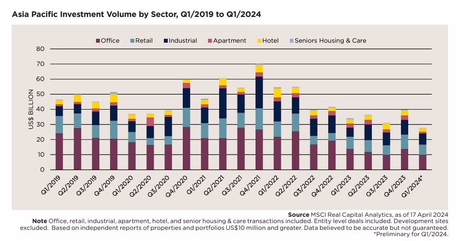 Báo cáo đầu tư khu vực châu Á - Thái Bình Dương quý I/2024 của Savills cho biết, tổng quan thị trường bất động sản thương mại vẫn yếu. Ước tính sơ bộ cho thấy tổng giá trị đầu tư khu vực (các giao dịch trị giá trên 10 triệu USD, không bao gồm các dự án đang phát triển và các giao dịch đang chờ xử lý) giảm 18,6% xuống còn 27,7 tỷ USD trong quý đầu tiên.