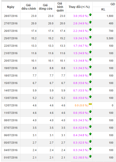 Cổ phiếu DTV của CTCP Phát triển điện nông thôn Trà Vinh đang “gây bão” trên Upcom khi trong 22 phiên giao dịch gần nhất thì tăng trần tới 21 phiên. Đóng cửa phiên giao dịch 28/7, thị giá DTV đã lên tới 23.000đ/cp, cao gấp 15 lần thời điểm cách đây 1 tháng.