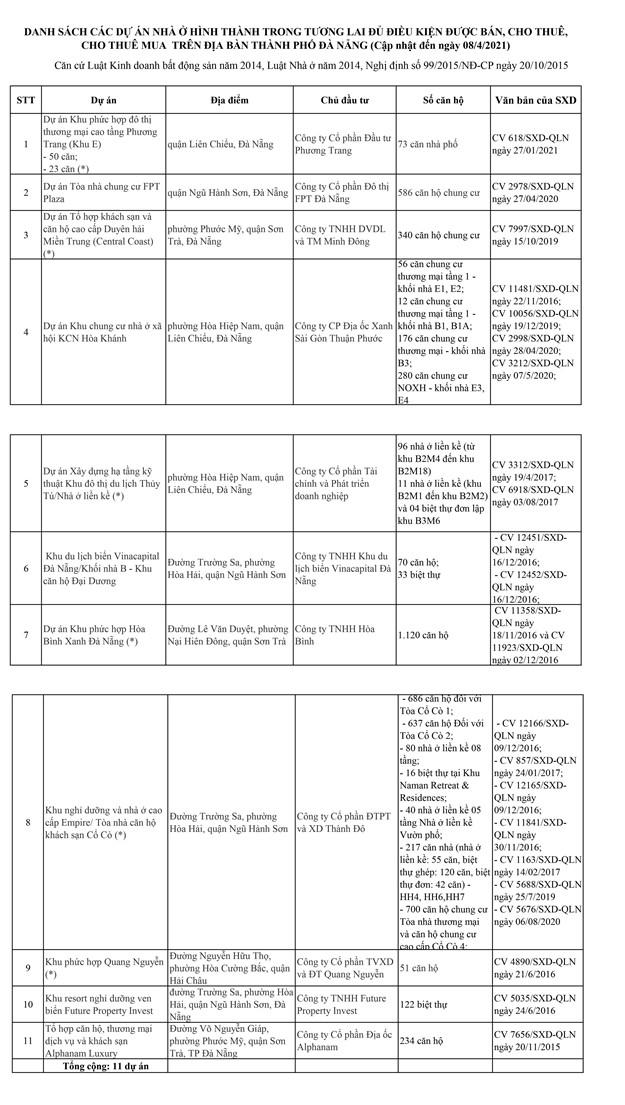Cụ thể, theo danh sách Sở Xây dựng TP Đà Nẵng công bố, những dự án nhà ở hình thành trong tương lai đủ điều kiện được bán, cho thuê, cho thuê mua trên địa bàn TP Đà Nẵng (cập nhật đến ngày 08/04/2021) gồm: