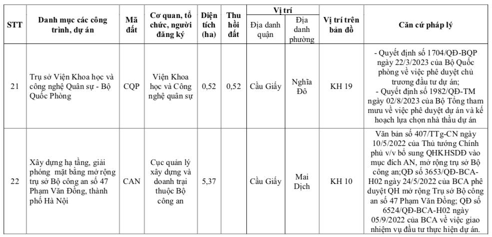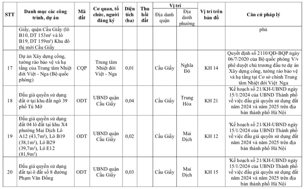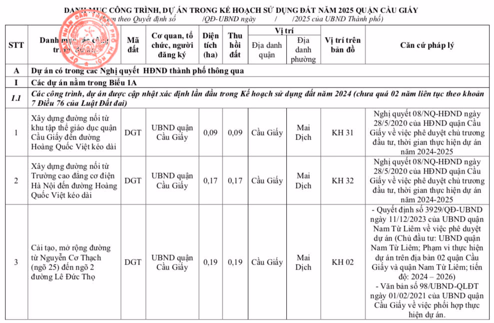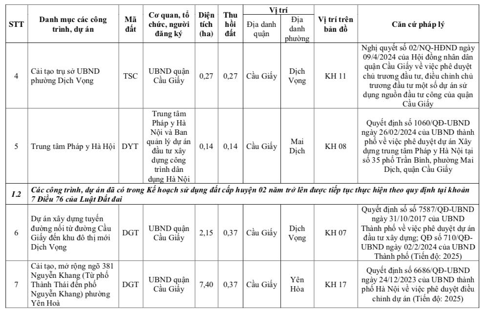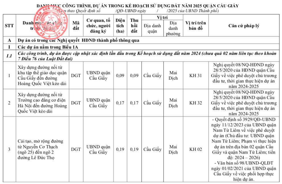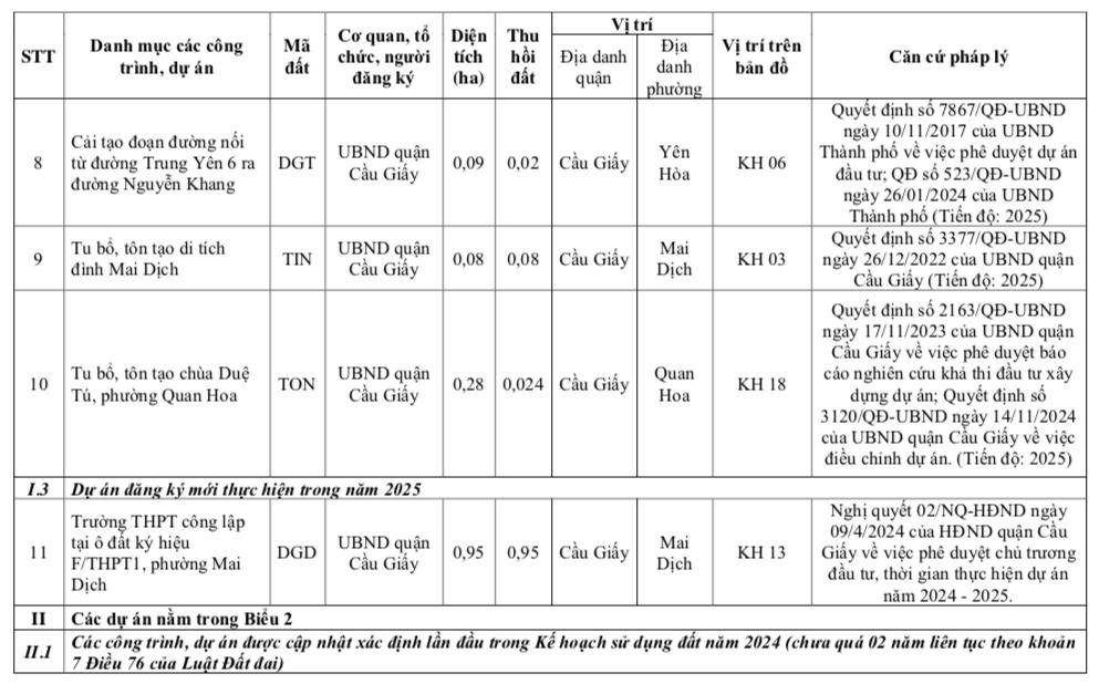 UBND TP Hà Nội vừa ban hành quyết định về việc phê duyệt kế hoạch sử dụng đất năm 2025 quận Cầu Giấy. Theo đó, danh mục các công trình, dự án nằm trong kế hoạch sử dụng đất năm 2025 bao gồm 22 dự án với tổng diện tích là 28,36ha.