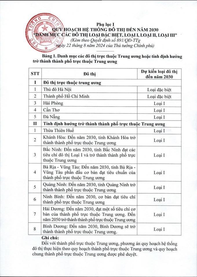 Theo đó, cả nước có 5 đô thị trực thuộc Trung ương gồm: Thủ đô Hà Nội, Thành phố Hồ Chí Minh (dự kiến đến năm 2030 là đô thị loại đặc biệt), Hải Phòng, Cần Thơ, Đà Nẵng (dự kiến đến năm 2030 là đô thị loại I).