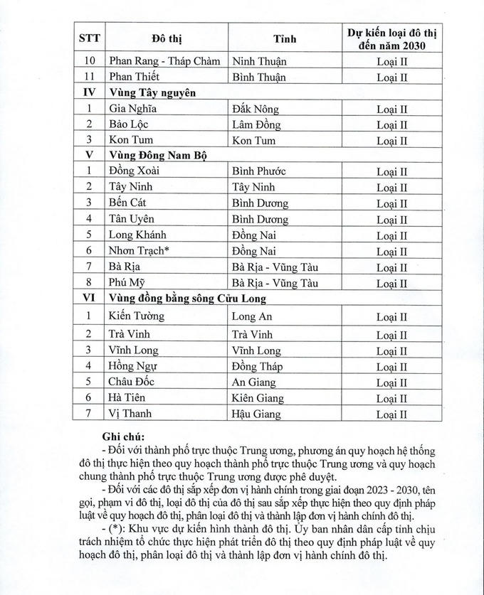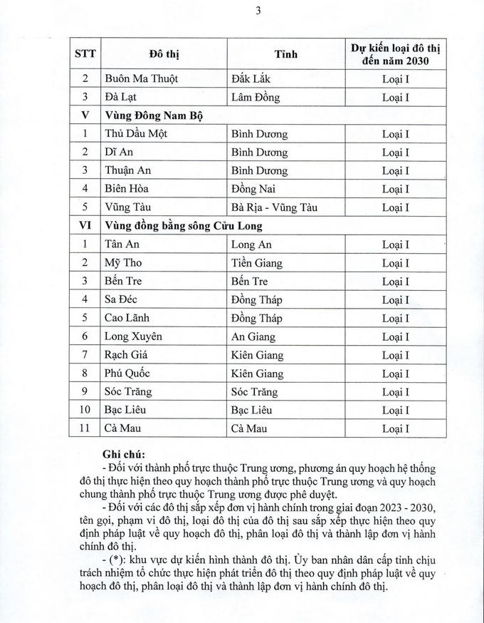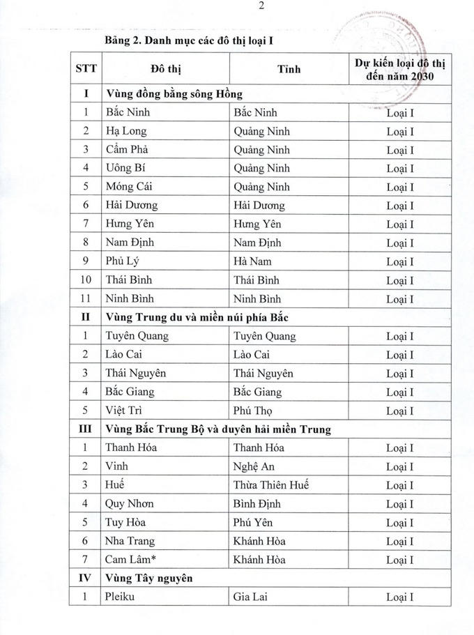 Quy hoạch ban hành Danh mục 42 đô thị loại I, trong đó vùng Đồng bằng sông Hồng có 11 đô thị, vùng Trung du và miền núi phía Bắc có 5 đô thị, vùng Bắc Trung Bộ và Duyên hải miền Trung có 7 đô thị, vùng Tây Nguyên có 3 đô thị, vùng Đông Nam Bộ có 5 đô thị, vùng đồng bằng sông Cửu Long có 11 đô thị.