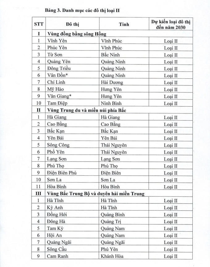 Theo quu hoạch, cả nước có 50 đô thị loại II, trong đó vùng Đồng bằng sông Hồng có 10 đô thị, vùng Trung du và miền núi phía Bắc có 11 đô thị, vùng Bắc Trung Bộ và Duyên hải miền Trung có 11 đô thị, vùng Tây Nguyên có 3 đô thị, vùng Đông Nam Bộ có 8 đô thị, vùng Đồng bằng sông Cửu Long có 7 đô thị.