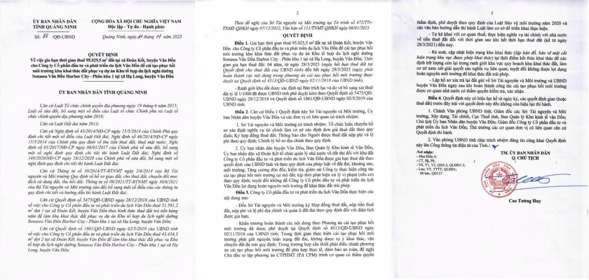Liên quan đến dự án này, hồi tháng 11/2022, UBND tỉnh Quảng Ninh đã ra quyết định số 3303/QĐ-UBND về việc thu hồi, hủy bỏ quyết định chấp thuận chủ trương dự án khu tổ hợp nghỉ dưỡng Sonasea Vân Đồn Harbor City – phân khu 2.