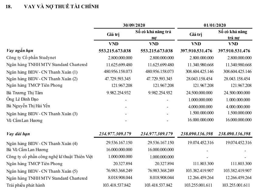Bên cạnh đó, vay và nợ thuê tài chính tại Apax Holdings tính đến 30/9/2020 ở mức hơn 788 tỷ đồng bao gồm nợ vay ngắn hạn và vay dài hạn với chủ nợ lớn nhất là BIDV. Trong đó, nợ ngắn hạn đạt 553 tỷ đồng, tăng 39% so với đầu năm.