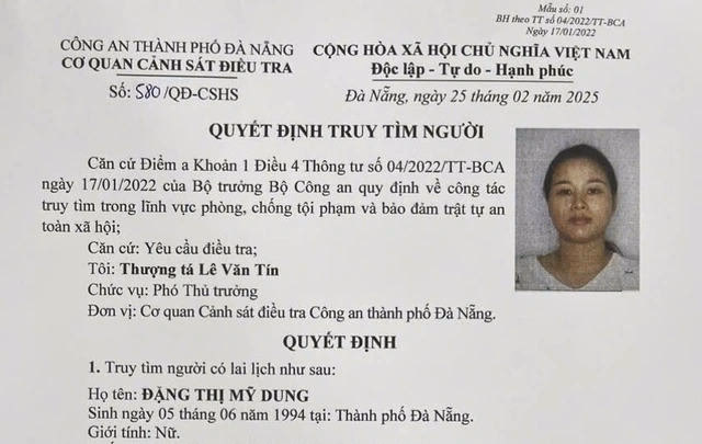 Ngày 25/2/2025, Cơ quan CSĐT Công an Tp. Đà Nẵng ra quyết định truy tìm đối với Đặng Thị Mỹ Dung (31 tuổi, trú quận Sơn Trà, Đà Nẵng) để phục vụ yêu cầu điều tra.