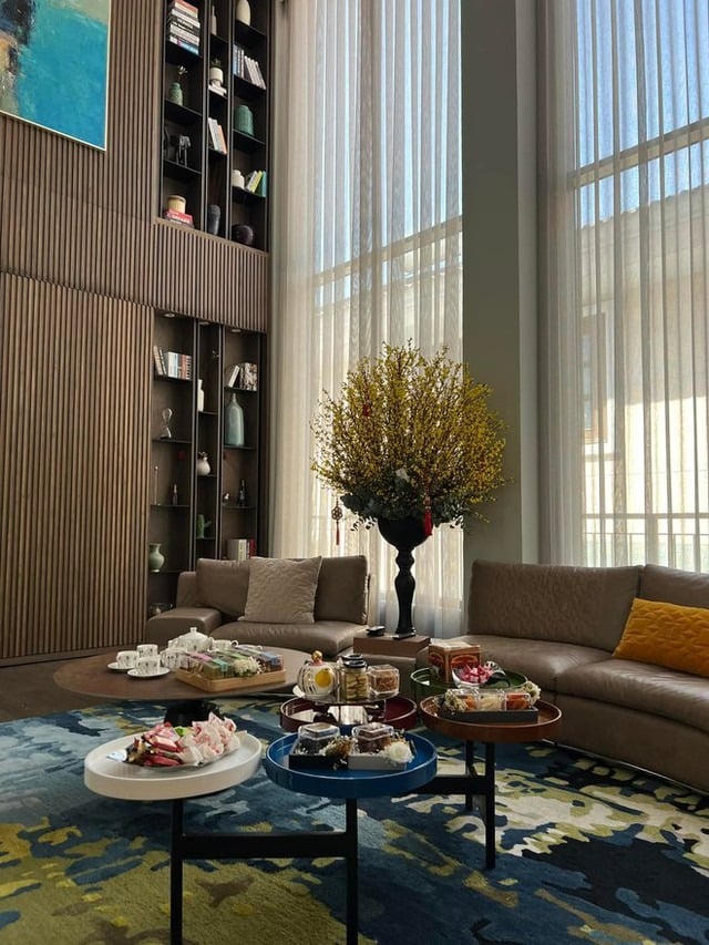 Không gian chính của căn biệt thự là phòng khách với thiết kế hiện đại, sang trọng. Đây cũng là nơi mà gia đình Cường Đô La quây quần trong những dịp đặc biêt và được Đàm Thu Trang trang trí lung linh trong các dịp Lễ Tết. Ngoài ra, Cường Đô La còn xây hẳn cả rạp chiếu phim mini, một không gian chơi rộng lớn cho các con. Không gian chơi này cũng được Đàm Thu Trang tận dụng làm studio chụp ảnh gia đình trong các dịp quan trọng.