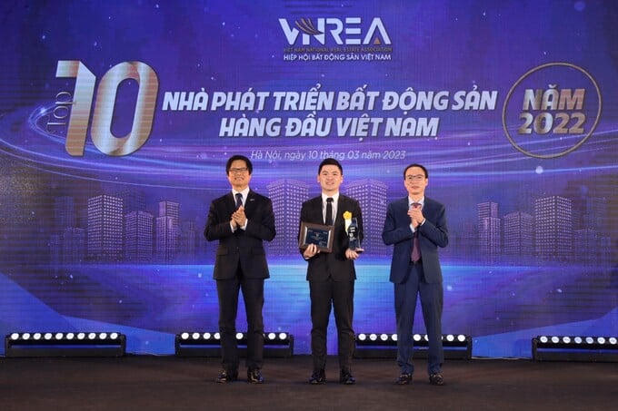 Ông Đỗ Vinh Quang, Phó Chủ tịch HĐQT Tập đoàn (giữa) nhận cúp và chứng nhận Top 10 nhà phát triển bất động sản hàng đầu Việt Nam năm 2022.