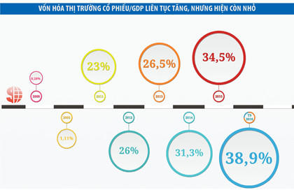 Theo cập nhật của Bộ Tài chính, đến cuối tháng 9/2016, mức vốn hóa của thị trường cổ phiếu đạt hơn 1,63 triệu tỷ đồng, tăng 20% so với cuối năm 2015, tương đương 38,9% GDP. Riêng dư nợ thị trường trái phiếu tương đương 24% GDP.