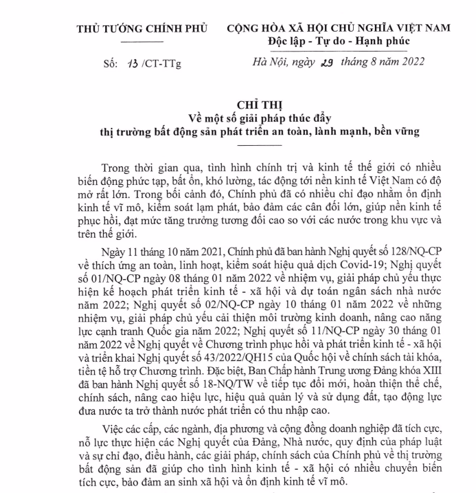 Ngày 29/8/2022, Phó Thủ tướng Lê Văn Thành vừa ký Chỉ thị 13/CT-TTg của Thủ tướng Chính phủ về một số giải pháp thúc đẩy thị trường bất động sản phát triển an toàn, lành mạnh, bền vững.
