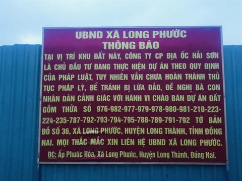 Những ngày gần đây, tại công trường dự án Khu dân cư theo quy hoạch (hiện đang được quảng cáo với tên thương mại là TD One Long Thành, tại xã Long Phước, huyện Long Thành, tỉnh Đồng Nai), do Công ty CP Địa ốc Hải Sơn (Công ty Hải Sơn) làm chủ đầu tư, được cắm bảng thông báo với nội dung: “UBND xã Long Phước thông báo: Tại vị trí khu đất này, Công ty Hải Sơn là chủ đầu tư đang thực hiện dự án theo quy định của pháp luật, tuy nhiên vẫn chưa hoàn thành thủ tục pháp lý.