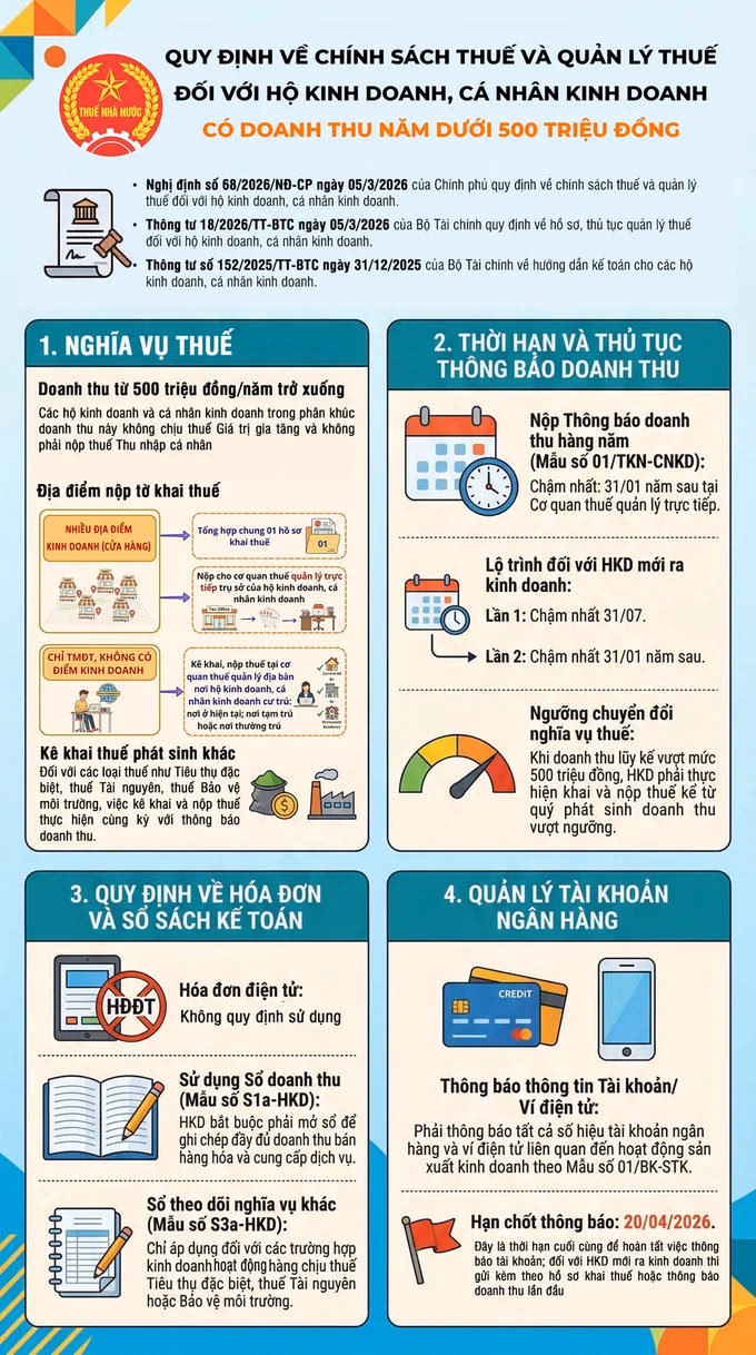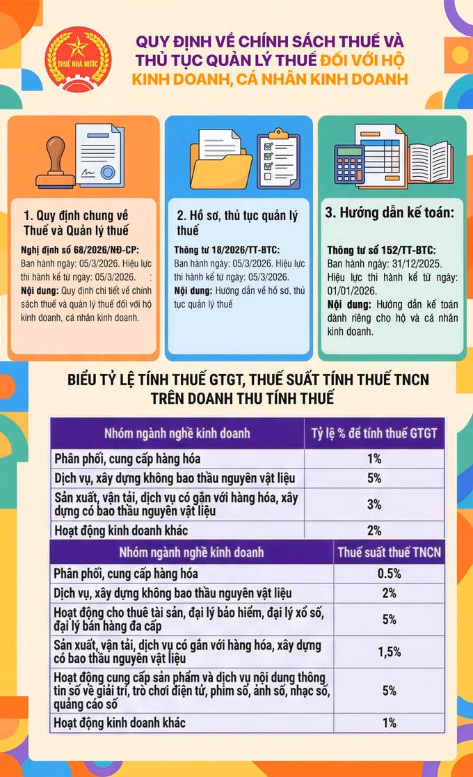 Chính sách thuế và quản lý thuế với hộ kinh doanh, cá nhân kinh doanh Cục Thuế vừa có hướng dẫn cụ thể về chính sách thuế và quản lý thuế đối với hộ kinh doanh, cá nhân kinh doanh. Thứ Ba 31/03/2026 08:40 (GMT+7) Nguồn: Cục Thuế PV TheoTài chính Doanh nghiệp