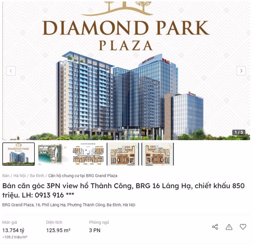 Theo khảo sát thực tế trên trang Batdongsan.com.vn, giá bán căn hộ ở tòa Chung cư cao cấp Diamon Park Plaza (16 Láng Hạ, quận Ba Đình) gây “choáng” với hơn 100 triệu đồng/m2.