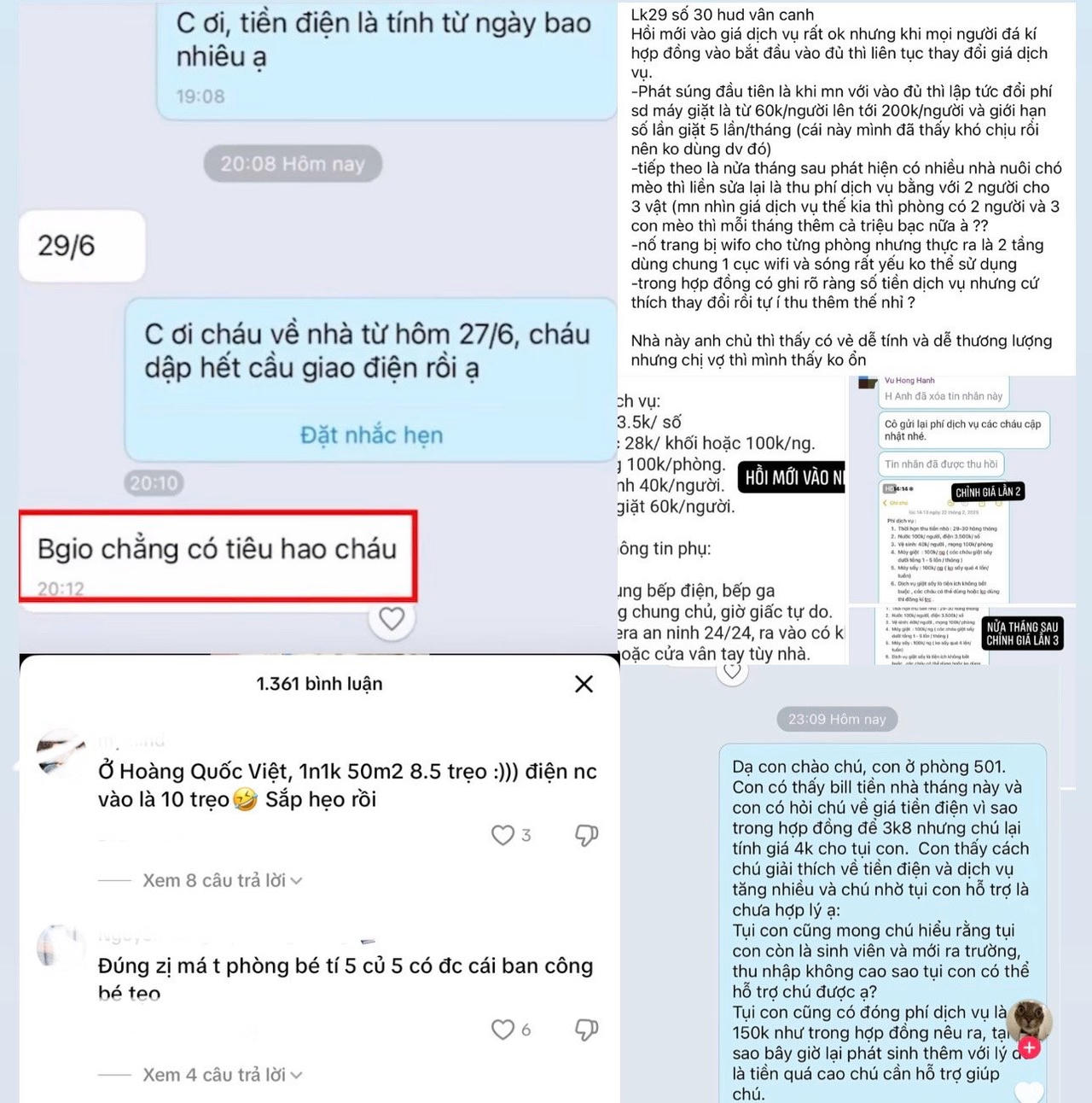 Nhiều người thuê khác cũng phản ánh tình trạng chủ nhà tùy tiện thay đổi mức phí với lý do “tự đặt”: thêm thành viên thì tăng gấp đôi tiền dịch vụ, nuôi thú cưng thì bị thu thêm phí vệ sinh dù không có nhu cầu, thậm chí bị giới hạn số lần giặt quần áo mỗi tuần.