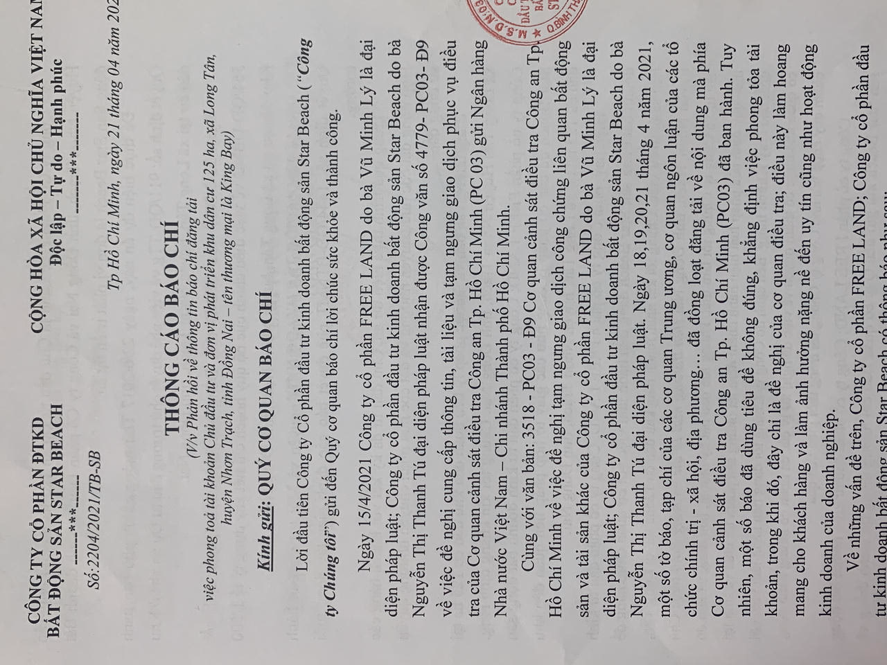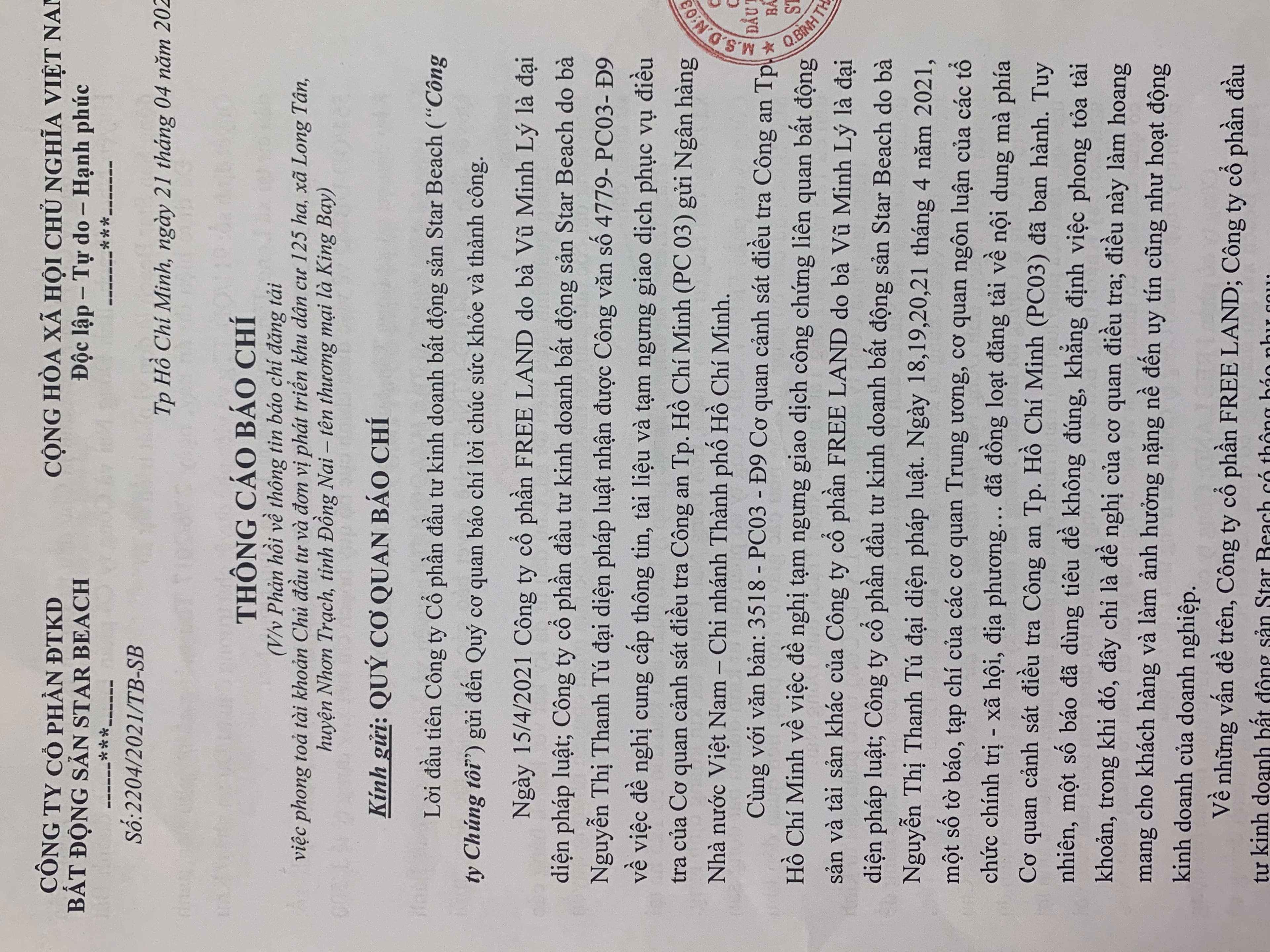 Trước đó, vào ngày 15/3/2021, Cơ quan Cảnh sát điều tra - Công an TP.HCM đã ban hành Văn bản số 4779/PC03-Đ9 đề nghị Ngân hàng Nhà nước Việt Nam – Chi nhánh TP HCM cung cấp thông tin, tài liệu và tạm ngưng giao dịch tài khoản của Công ty CP Free Land và Công ty CP đầu tư kinh doanh bất động sản Star Beach để phục vụ công tác điều tra.