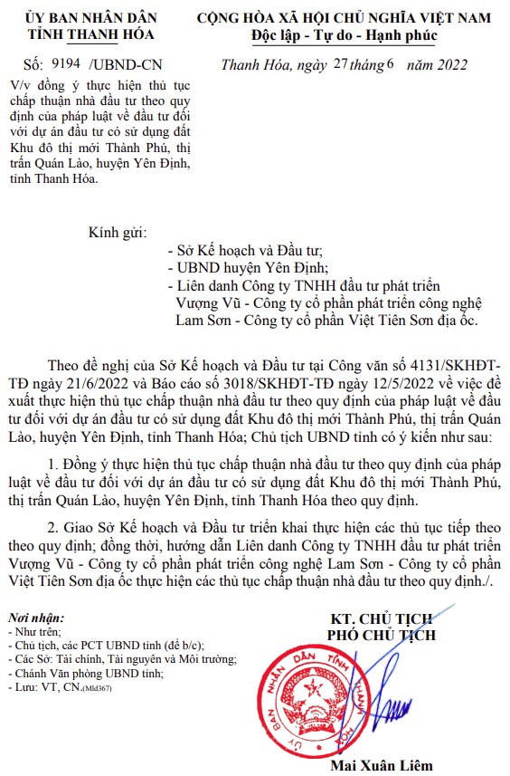 UBND tỉnh Thanh Hóa ngày 27/6/2022 đã có văn bản số 9194/UBND-CN về việc đồng ý thực hiện thủ tục chấp thuận nhà đầu tư đối với dự án Khu đô thị mới Thành Phú, thị trấn Quán Lào, huyện Yên Định.