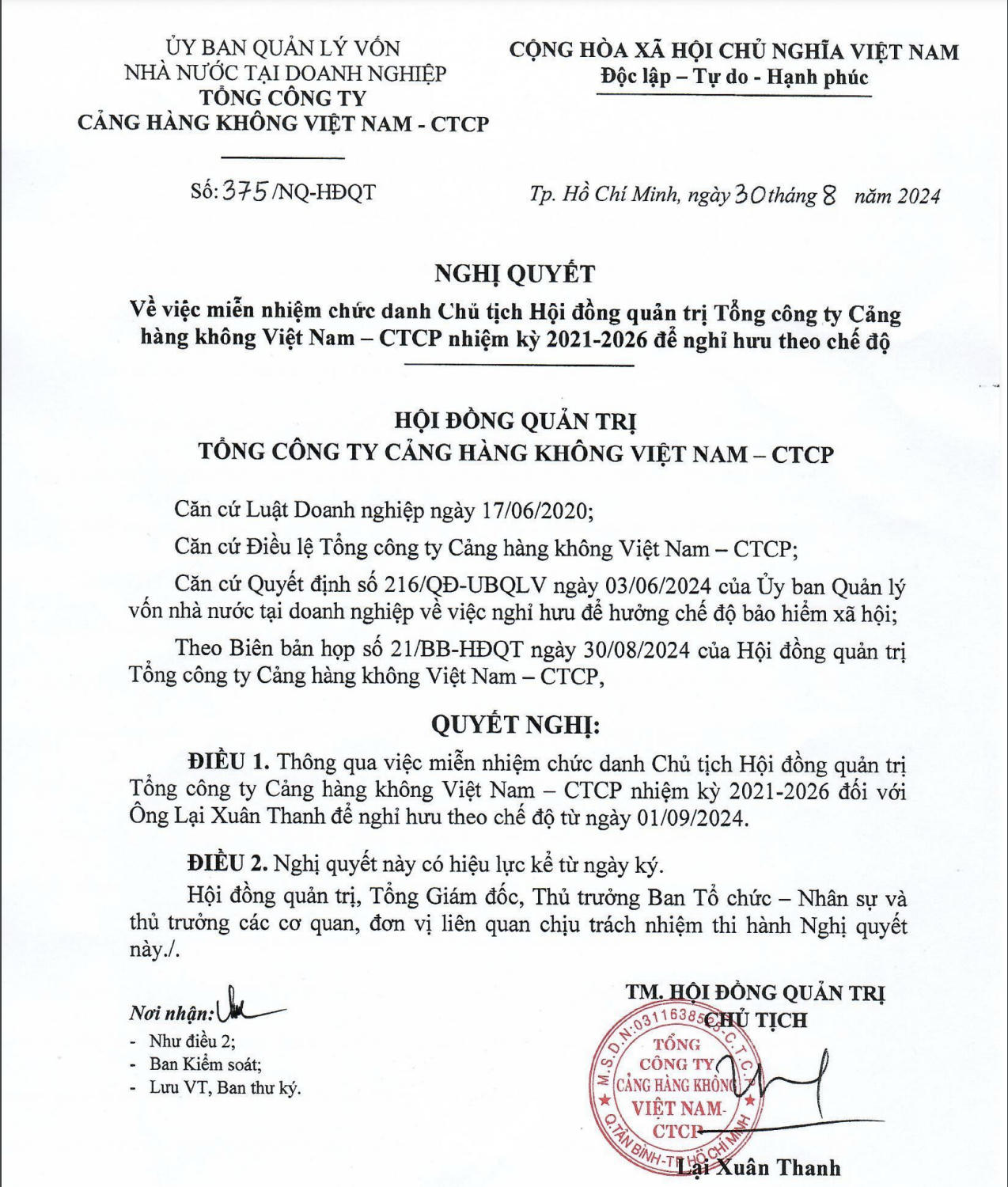 Tổng công ty Cảng hàng không Việt Nam (UPCoM: ACV) vừa thông báo thay đổi nhân sự cấp cao. Theo đó, HĐQT công ty quyết định miễn nhiệm ông Lại Xuân Thanh khỏi vị trí chủ tịch HĐQT để hưởng chế độ hưu trí theo quy định kể từ ngày 1/9/2024. Hiện công ty chưa công bố người thay thế ông Lại Xuân Thanh ngồi ghế nóng ACV.