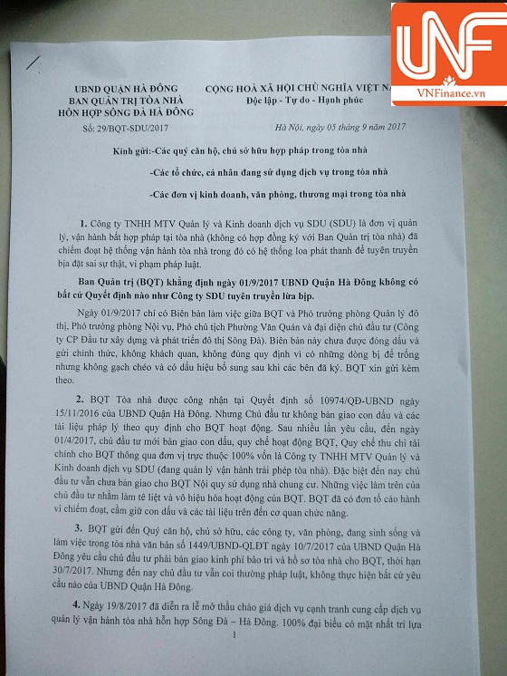 Theo tìm hiểu của PV, trước đó tòa nhà Sông Đà đượcgiao Công ty TNHH MTV Kinh doanh dịch vụ SDU là công ty con của công ty CPĐTXD và phát triển đô thị Sông Đà (gọi tắt là công ty Sông Đà) làm đơn vị quản lý vận hành tòa nhà.