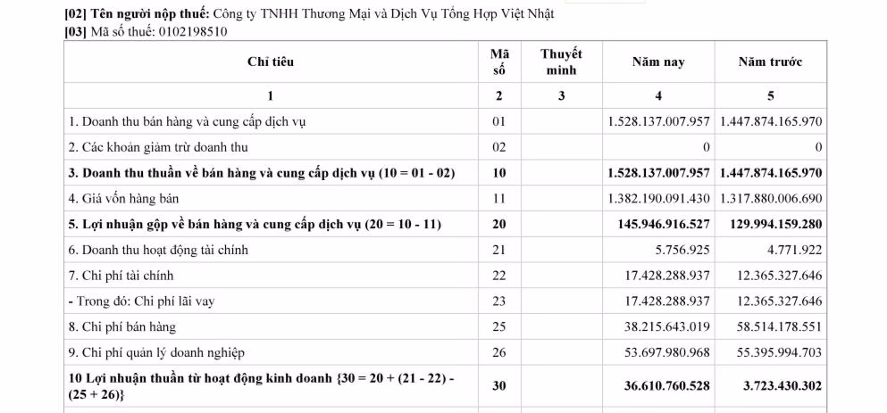 Theo dữ liệu của VietnamFinance, năm 2023 Công ty Việt Nhật ghi nhận doanh thu hơn 1.528,1 tỷ đồng, tăng hơn 80 tỷ đồng, tương đương tăng 5,5% so với cùng kỳ năm ngoái. Trong đó, doanh thu bán hàng là hơn 1.502,9 tỷ đồng và doanh thu cung cấp dịch vụ gần 25,2 tỷ đồng.