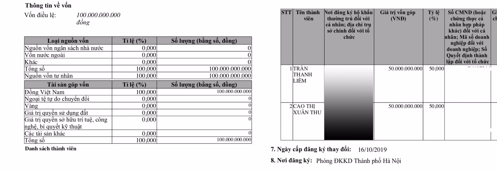 Ngày 21/9/2018, thành viên góp vốn có sự thay đổi khi Lê Đức Doanh không còn xuất hiện mà thay bằng Trần Thanh Liêm (góp 10 tỷ đồng, tỷ lệ 50% vốn góp). Thành viên còn lại là Cao Thị Xuân Thu góp 10 tỷ đồng (chiếm tỷ lệ 50%).
