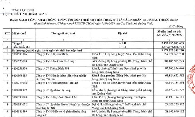 Cục Thuế tỉnh Quảng Ninh vừa công bố danh sách người nộp thuế nợ tiền thuế và các khoản thu thuộc ngân sách nhà nước đến thời điểm ngày 31/3/2024.