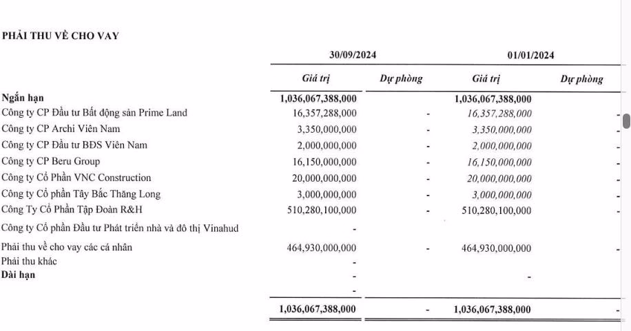 Chưa dừng ở đó, khoản phải thu về cho vay ngắn hạn lại ghi nhận ở mức 1.033 tỷ đồng. Con số này nằm tại loạt doanh nghiệp có thể kể tên như: Công ty cổ phần Tập đoàn R&H; Công ty cổ phần VNC Construction; Công ty cổ phần Beru Group; Công ty cổ phần đầu tư bất động sản Prime Land; ….