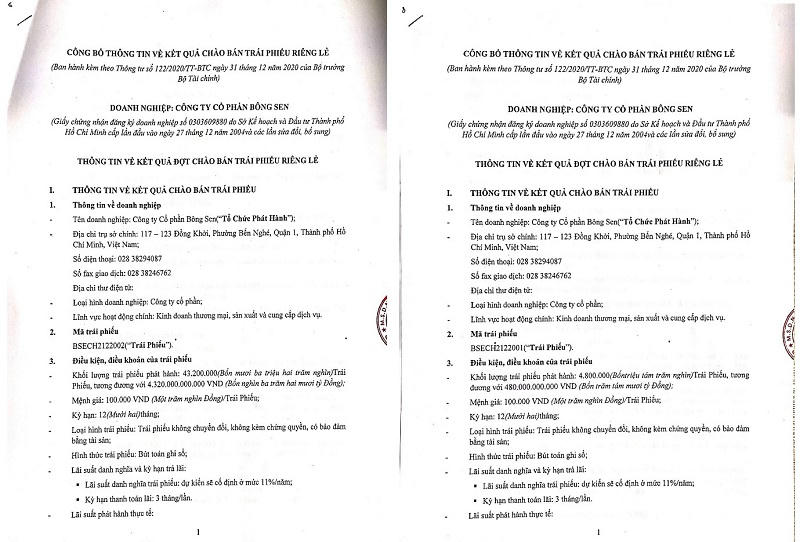 Cả hai thương vụ phát hành trái phiếu đều được Bông Sen Corp thực hiện trong ngày 24/8/2021, kỳ hạn 1 năm, lãi suất dự kiến cố định ở mức 11%/năm.