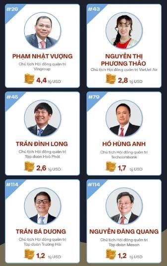4 tỷ phú Việt Nam còn lại trong danh sách gồm ông Trần Đình Long, Chủ tịch HĐQT Tập đoàn Hòa Phát đang có tài sản 2,6 tỷ USD; ông Hồ Hùng Anh, Chủ tịch HĐQT Techcombank có 1,8 tỷ USD; ông Nguyễn Đăng Quang, Chủ tịch HĐQT Tập đoàn Masan và ông Trần Bá Dương, Chủ tịch HĐQT Tập đoàn Trường Hải đều có 1,2 tỷ USD. Xem thêm
