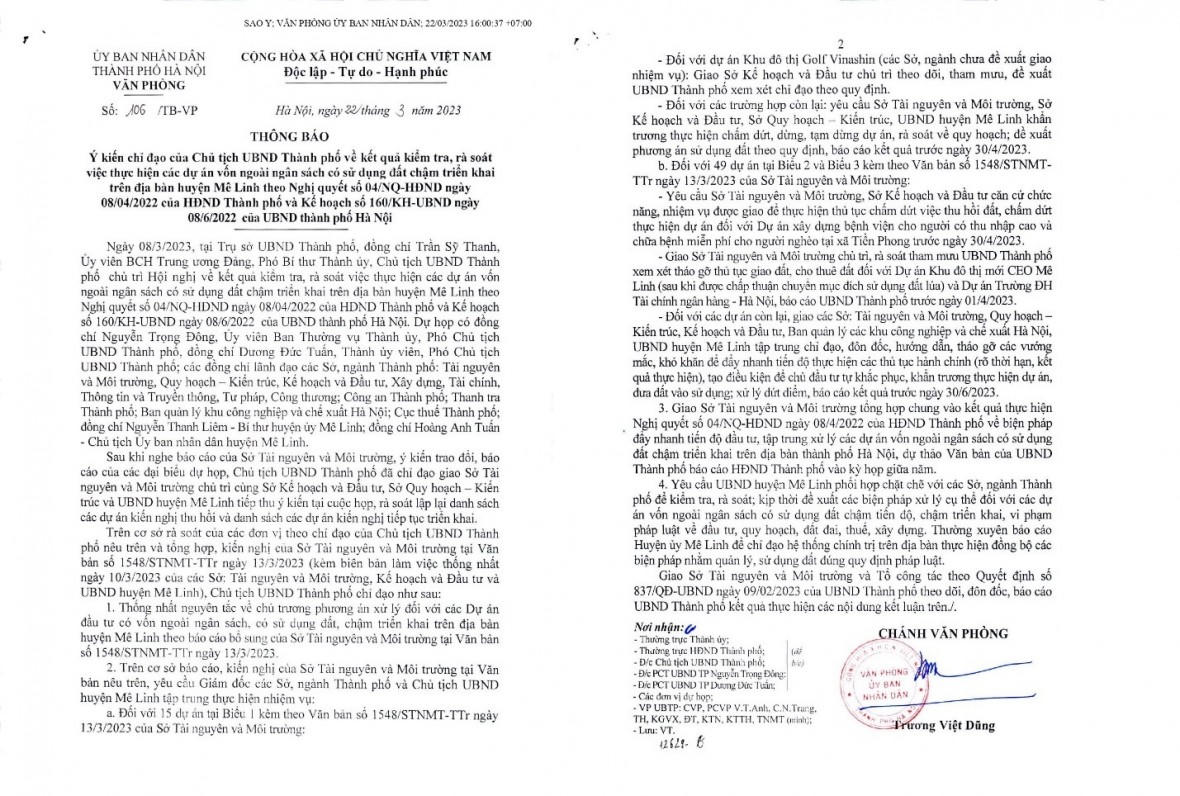 Văn bản nêu rõ, Chủ tịch UBND Thành phố thống nhất nguyên tắc về chủ trương phương án xử lý đối với các Dự án đầu tư có vốn ngoài ngân sách, có sử dụng đất, chậm triển khai trên địa bàn huyện Mê Linh theo báo cáo bổ sung của Sở Tài nguyên và Môi trường ngày 13/3/2023.