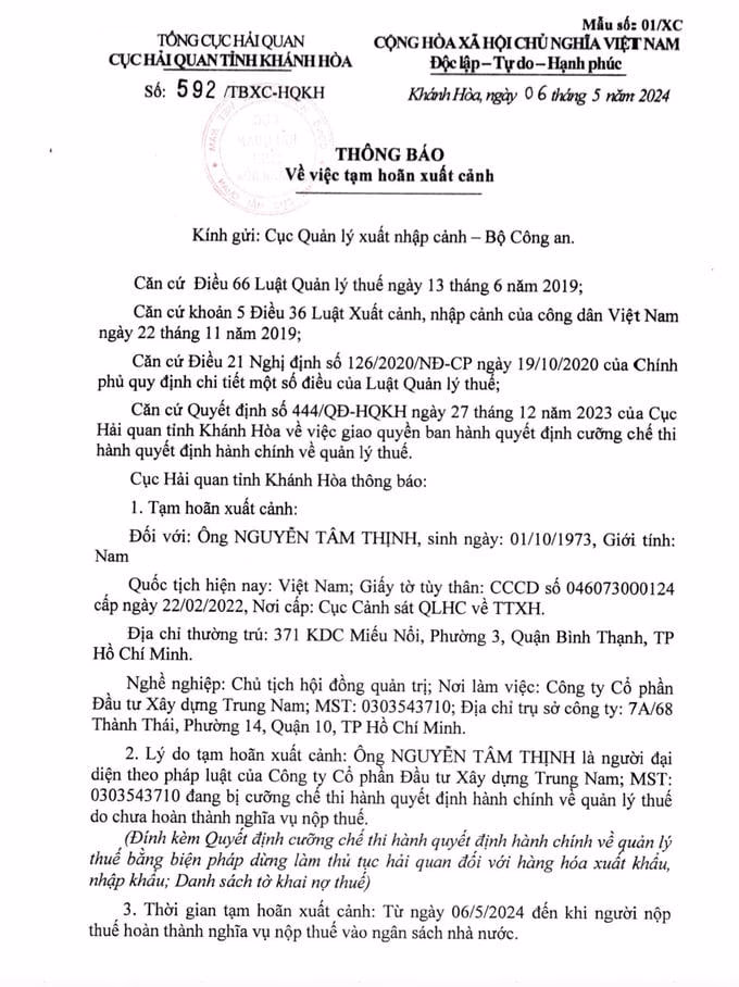 Theo thông tin từ Cục Hải quan Khánh Hòa, đơn vị đã ban hành Thông báo gửi Cục Quản lý xuất nhập cảnh - Bộ Công an đề nghị tạm hoãn xuất cảnh đối với ông Nguyễn Tâm Thịnh, sinh năm 1973, Chủ tịch Hội đồng quản trị (HĐQT) CTCP Đầu tư Xây dựng Trung Nam (địa chỉ: 7A/68 Thành Thái, phường 14, quận 10, TP. HCM, mã số thuế: 0303543710).