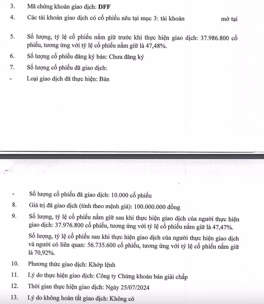 Gia đình Chủ tịch Đua Fat bị bán giải chấp cổ phiếu trong bối cảnh cổ phiếu DFF đã giảm 24 phiên liên tiếp, với hàng chục phiên giảm sàn. Kể từ đầu tháng 7 cho đến này, thị giá của DFF đã giảm 46%.
